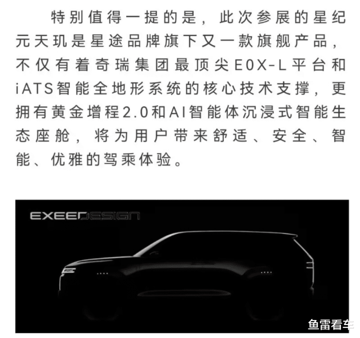 结果刚刚星途官方发布的信息里,又出现了一个新车型,当然概念版的可能性不小,命名为星纪元“天玑”,根据官方提及的信息,该车是E0X-L平台上开发的全新车型,借助核心的iATS智能全地形系统支撑,拥有黄金增程2.0和AI智能体生态座舱。